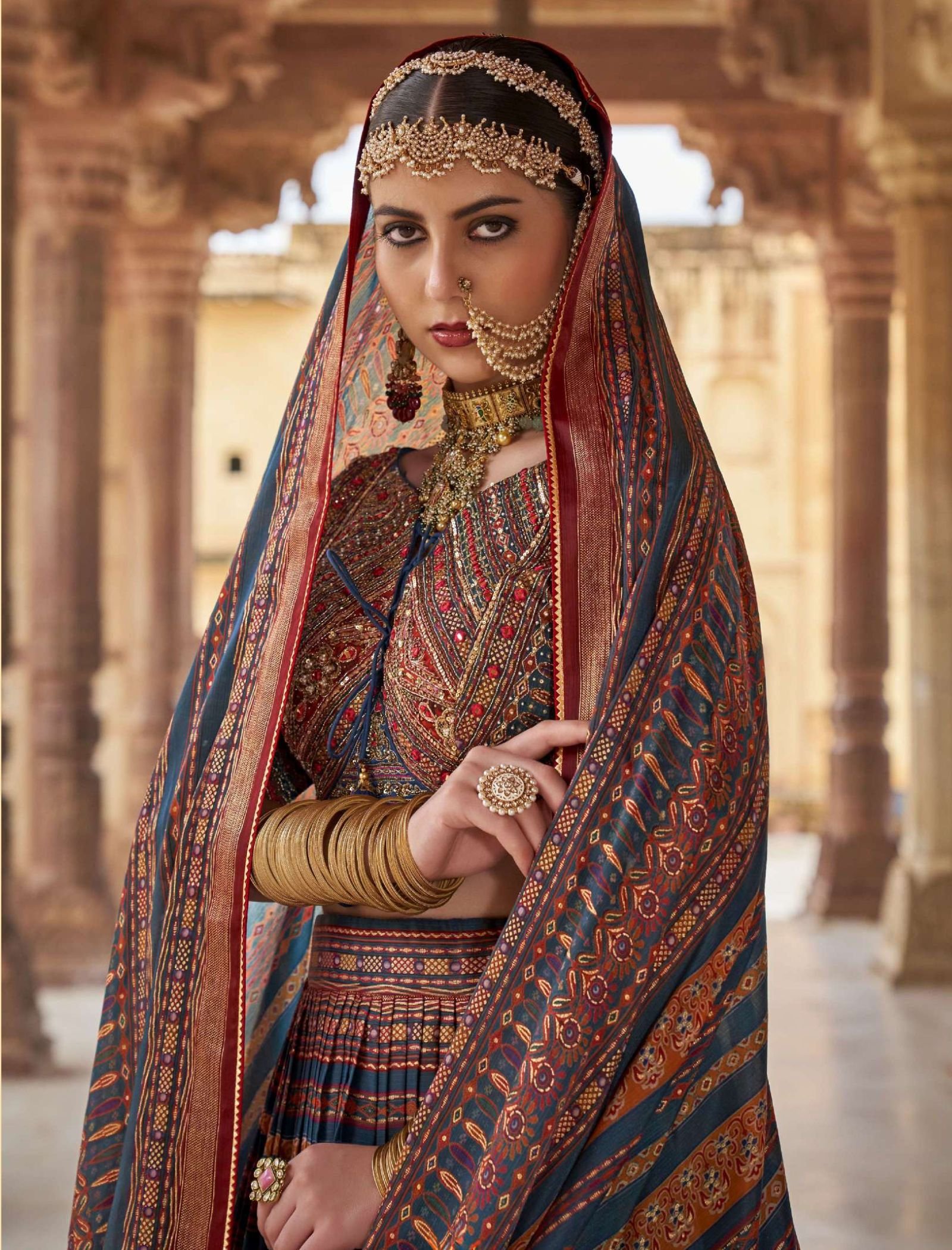 The multicolor lehenga features a vibrant palette of hues, intricately woven together to create a mesmerizing visual appeal. The flowing silhouette of the lehenga drapes gracefully, enhancing your feminine charm with every step you take.
