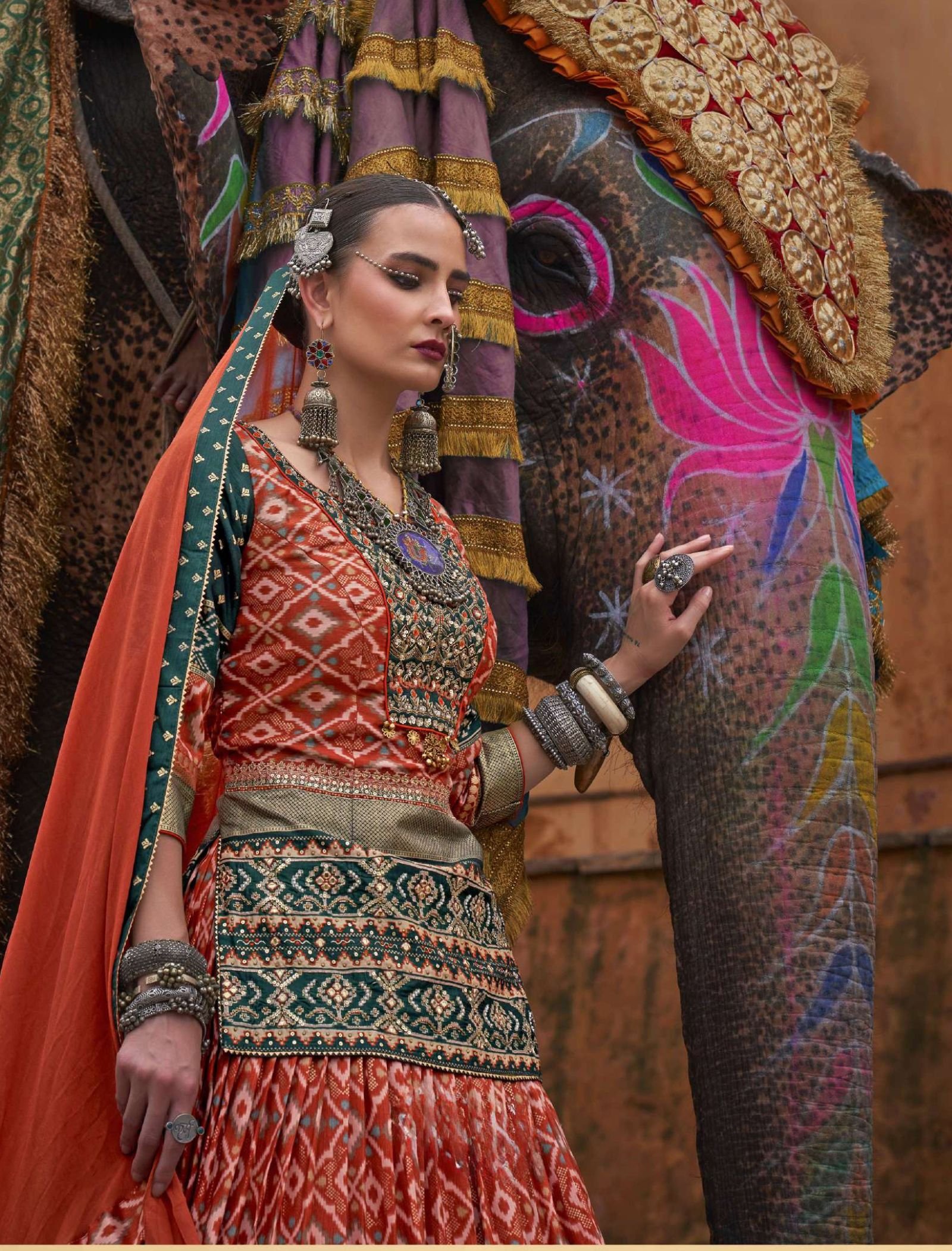 This Orange Crushed Lehenga Set, Adorned With Intricate Digital Prints and a Delicate Zari Border, Designed to Mesmerize and Enchant.