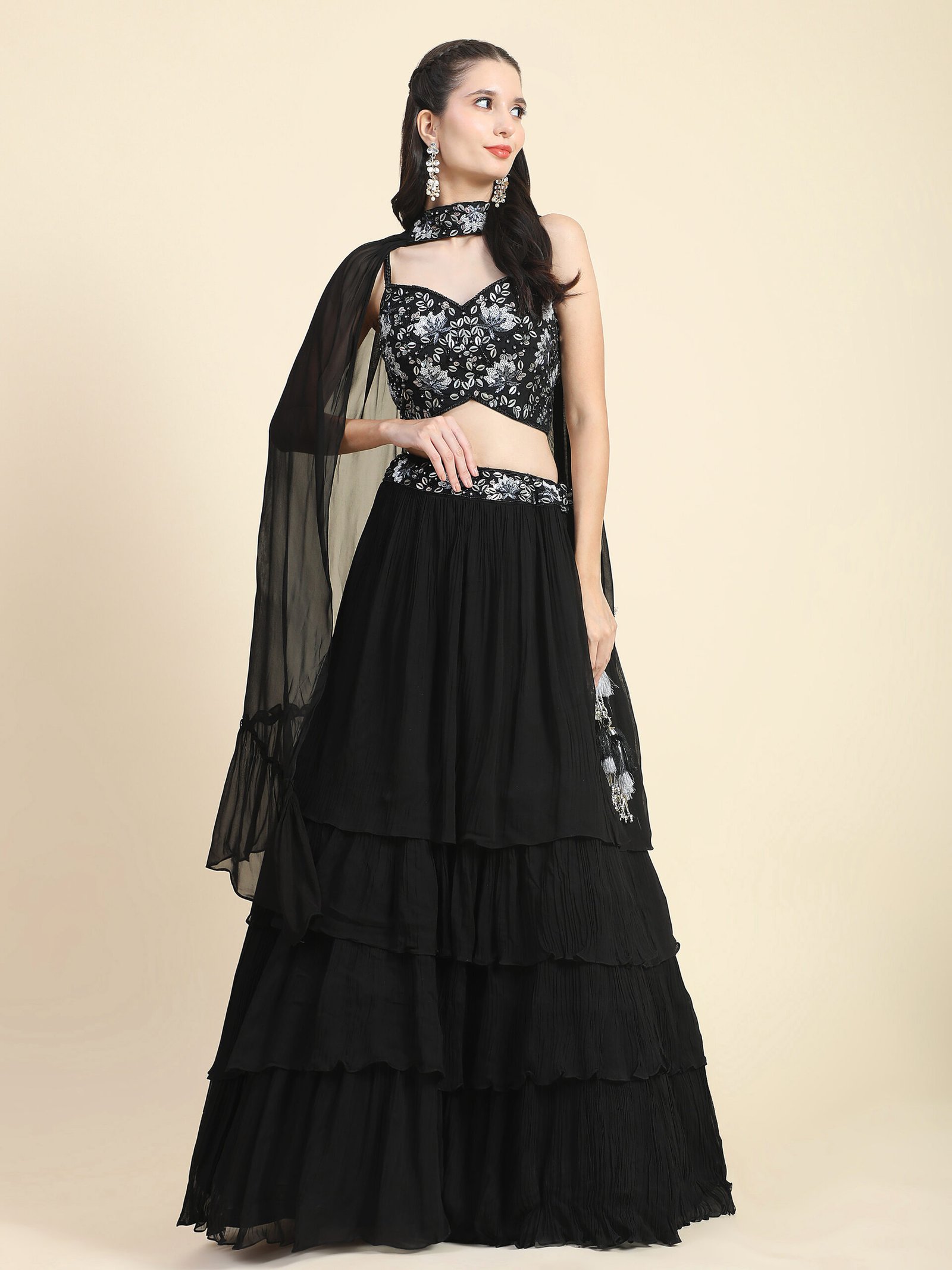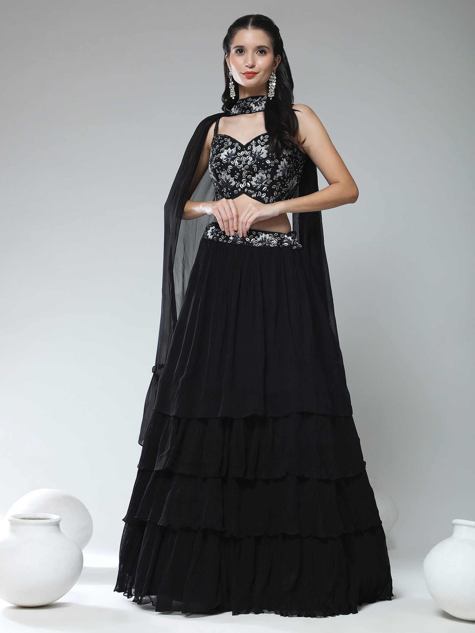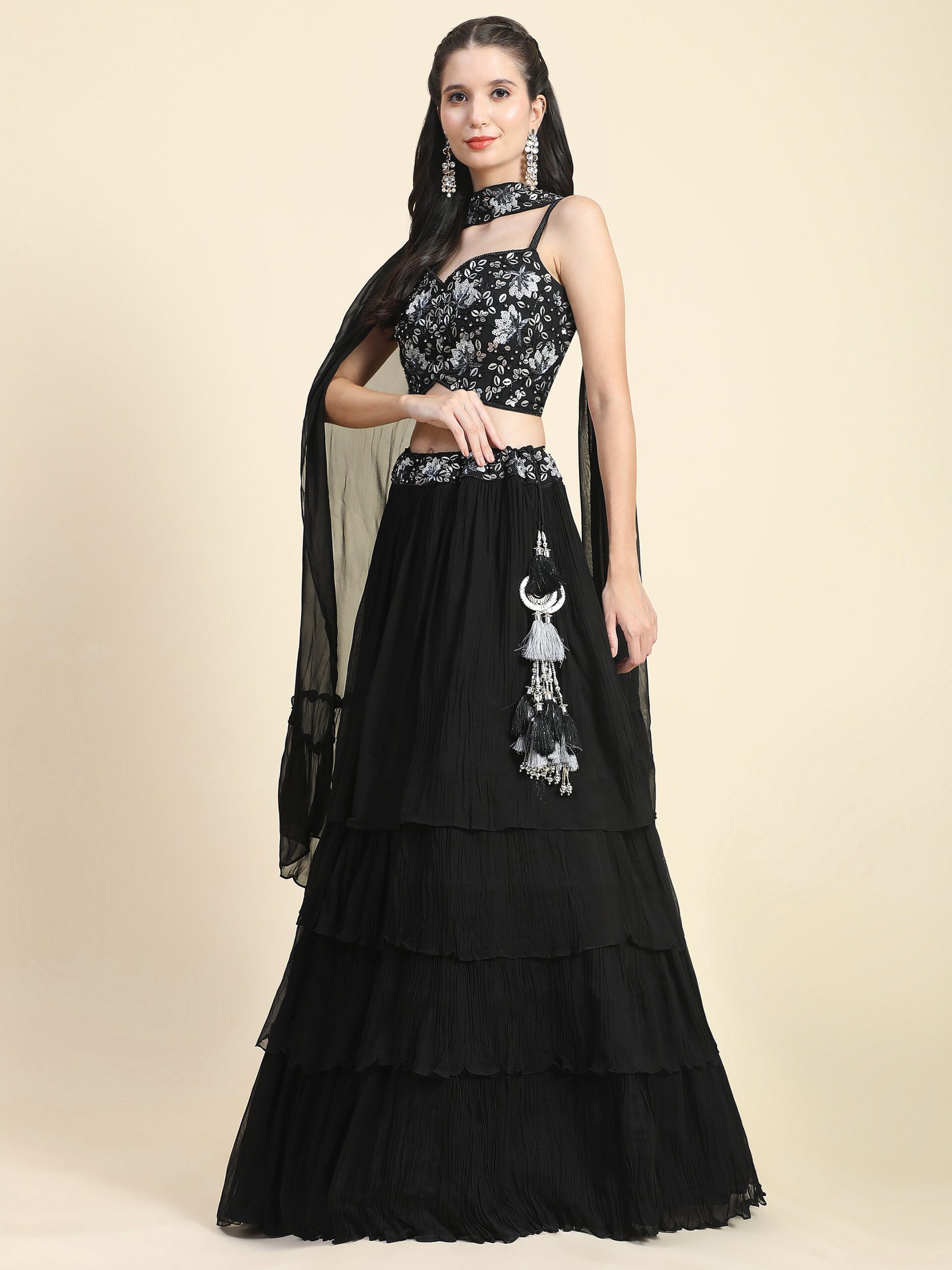 Phenav Black Silver-Toned Embroidered Sequinned Ready to Wear Lehenga Blouse With Dupatta