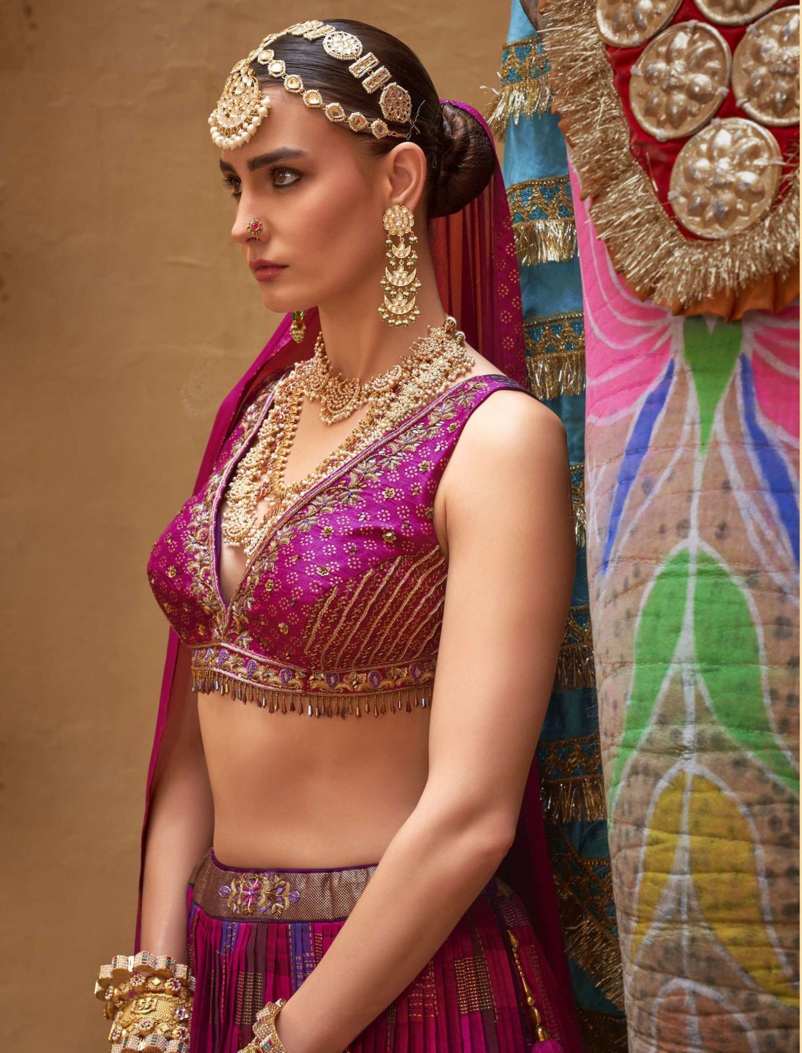 Complementing the lehenga is a beautifully adorned pink blouse, intricately embellished with intricate sequence work that seamlessly complements the overall aesthetic. The monochromatic harmony of the pink ensemble creates a sophisticated and cohesive look, exuding understated elegance.