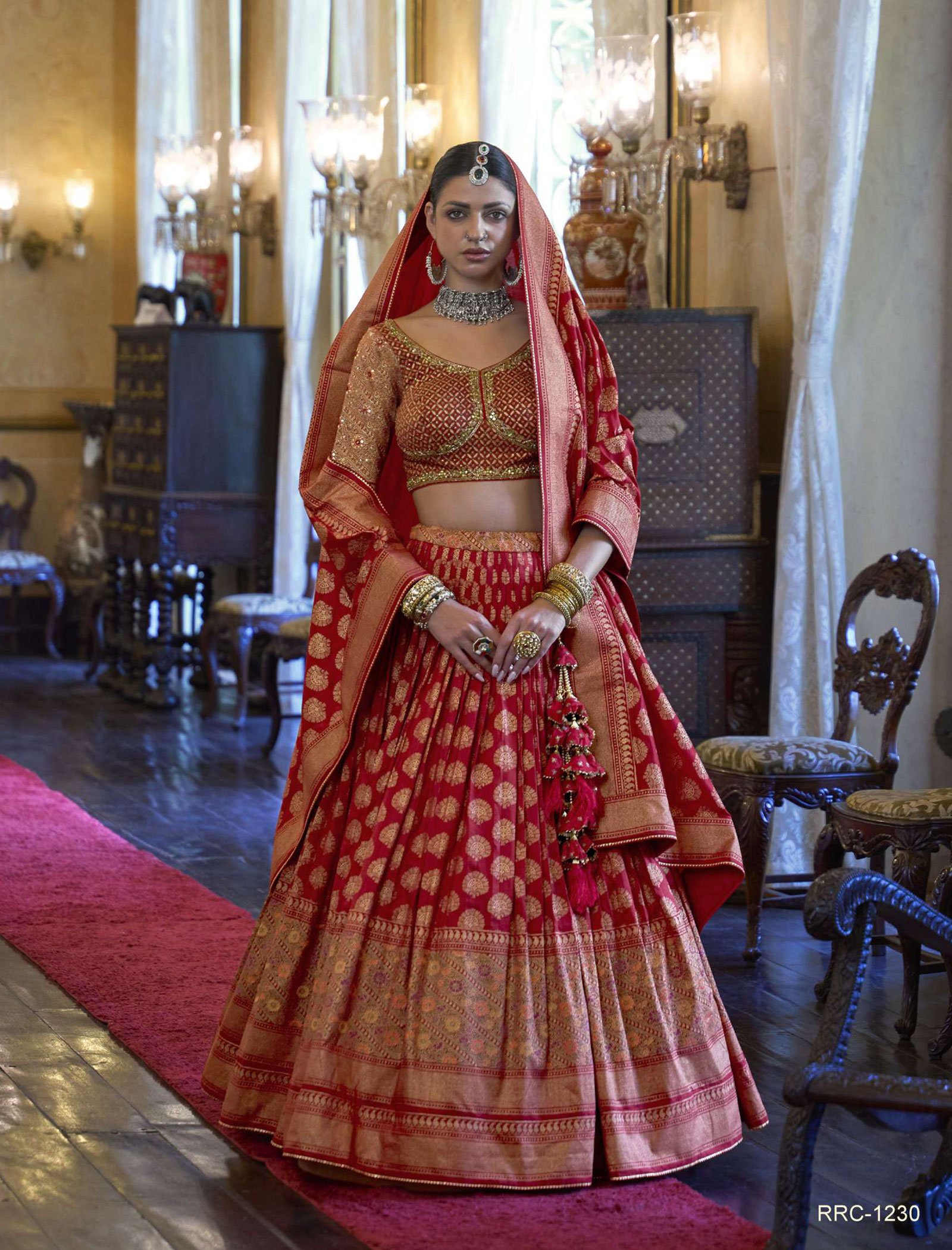 “Gorgeous red and golden lehenga ensemble featuring intricate sequence work on the blouse. Paired with a combination dupatta, this ensemble exudes timeless elegance, perfect for making a grand entrance at weddings and festive celebrations.”